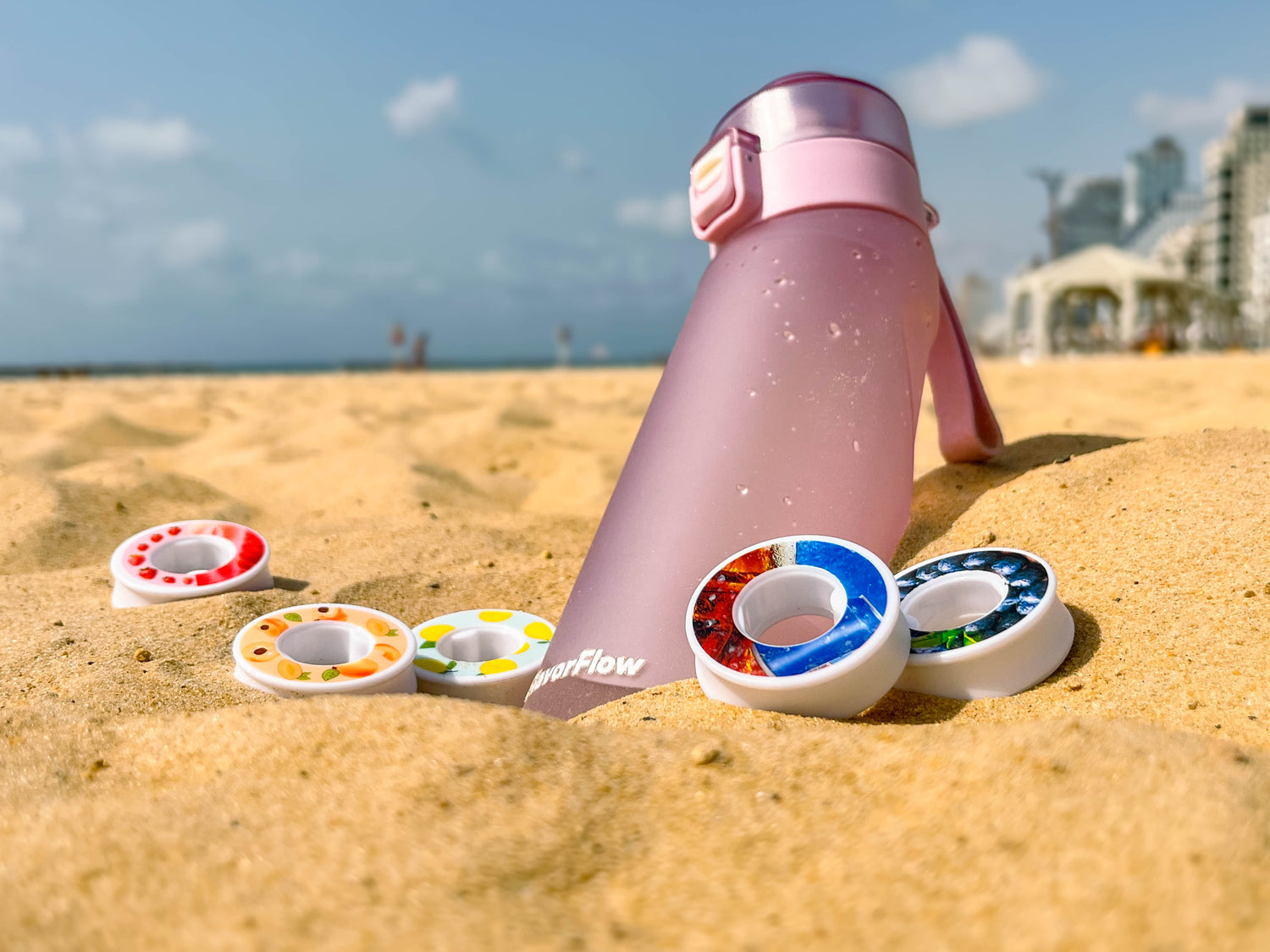 בקבוק המים הייחודי מבית ™FlavorFlow מגיע עם טבעות ריח המתלבשות על פיית הבקבוק ויוצרות אשלייה של שתיית מים בטעמים